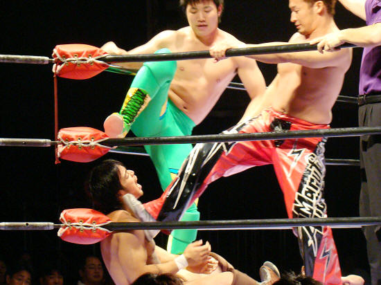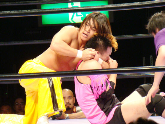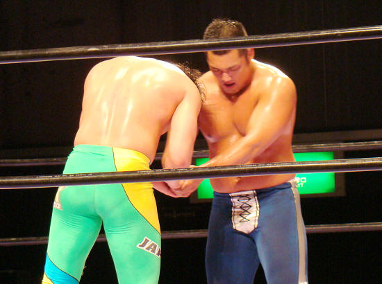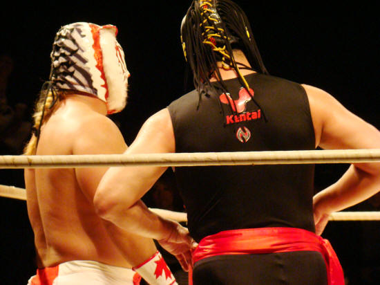 試合が始まるとKENTAは放任、丸藤はちょこちょこと助けに入る。