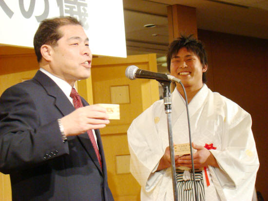 お母様の富士子さんが壇上で勝彦から花束を贈呈され…。感慨深い場面でした。