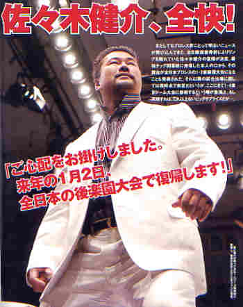 バックステージで報道陣に囲まれた健介は、満面の笑みを浮かべながら改めて完全復帰を宣言。1.2以降については、「自分の中で2日しか目に入っていない。自分の気持ちも(その先に)行っていないし、今はそれ以外のことは考えられない」と明言を避けたが、コンディション次第では、1月シリーズにそのまま出場することになるかもしれない。 (~中略~)締切り直前の情報によれば、新日本プロレスは健介サイドに1.4東京ドーム出場のオファーを出す方向で考えているという。