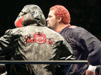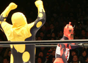 菊マスクを自ら脱ぐと、そこには素顔!でなく不動明王っぽいマスク。武藤のリアクションが素晴らし!怒りの菊ちゃん、実は強いのよとばかりにマジモードで反撃開始!