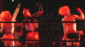 AHIIとオネーチャン達による勝利のダンス。はい、ご苦労さん。最後の体をクルリと変えての頭から落とすウラカンラナは凄かったけど、試合時間1分42秒は短すぎてペケ。