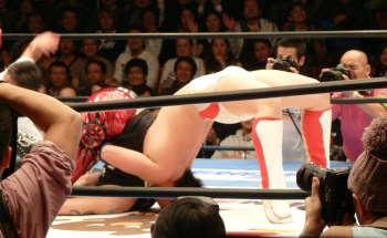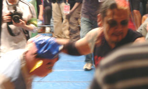終始リングの中&外で捕まりいたぶられる菊。あわやマスク脱がされそうに…(大阪流血事件の流れ?)