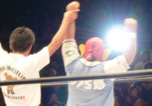 気合い充分ながら、どうしても体格差でTAKAが捕まる展開に。しかし膝の怪我から復帰したばかりなのに、TAKAはよく動く。バック転しての場外飛び(ケブラーダっていうの?)は凄い迫力だった!TAKAの気迫に比べ、ケアはちょっとおとなしすぎたかな…。も少し爆発力が見たかった。