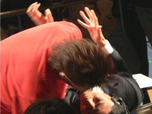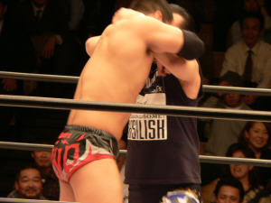 ほれ、やられて晒し者。KAZMAが痛めつけたあと、HARASHIMAのキックが側頭部(かな?)をまともに捕らえ、意識が飛んでしまった潮崎(ちょっとヤバかった)谷口ならわかるけど、潮崎が長時間捕まってグダグダは勘弁。