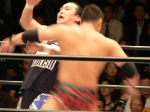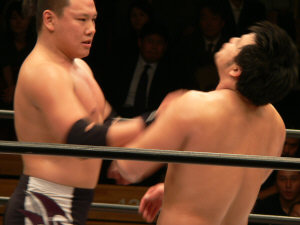 復活した潮崎とKAZMAの逆水平合戦(両者とも音が凄かった!)さすがに潮崎のチョップは厳しい。