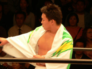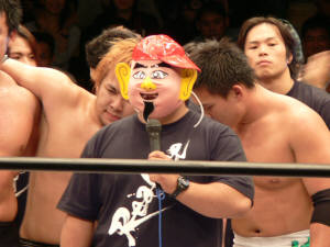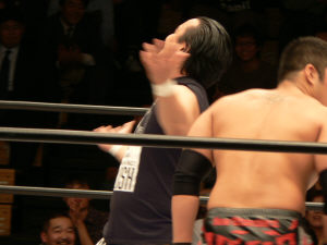 勤皇党独特の井出達。入場いきなり潮崎に突っかかって行くKAZMA。目標潮崎ロックオン!いいねいいね。