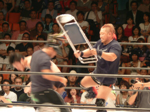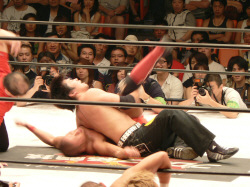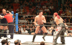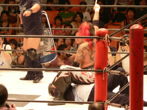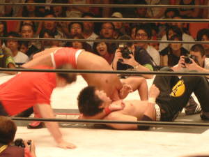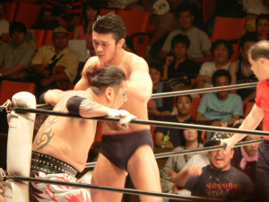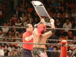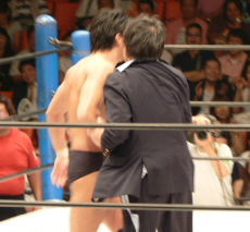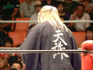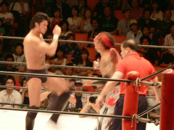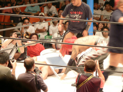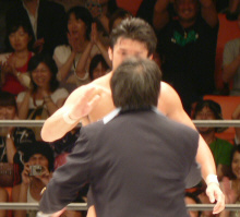 前回と同じ展開。いきなりの場外乱闘、試合始まる気配なし。この前は物凄く面白かったけれど、2回目ともなると「また?」強い刺激はすぐ飽きられる。それでも場内騒然、興奮するお客さん多数。これはこれで良いのかな。でもグダグダで終わるのは勘弁。