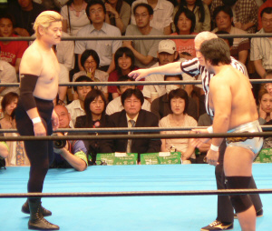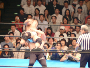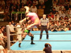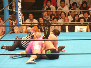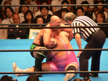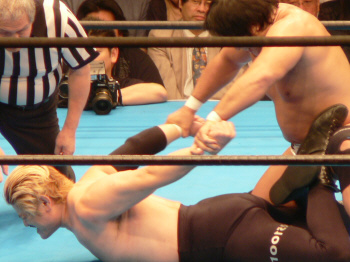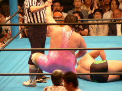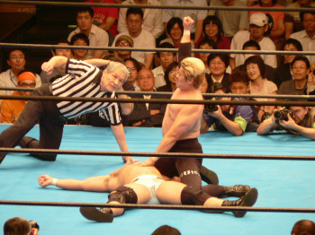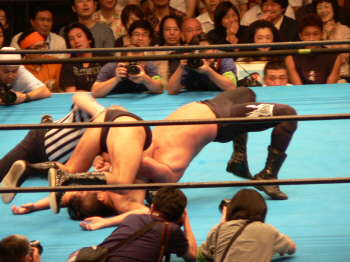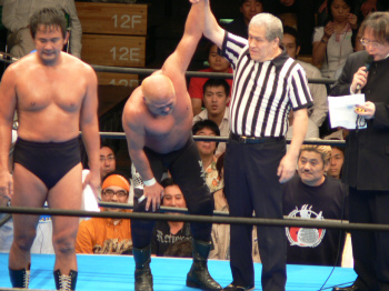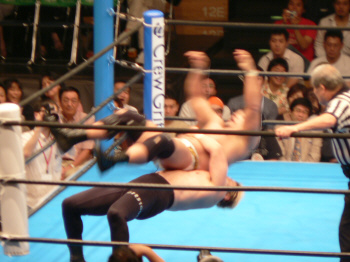 最後の最後でレフェリーやっちまった…。実はここで3カウント入ってた筈。だけど三つめスカしやがった。満場一致の「えー!?」せっかくいい具合に進行していたのに残念。