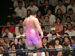 四方を向いての記念撮影。嬉しいサービスですね(長井は腰痛めて加われなかった)前列右端の青年は坂口氏のご長男だそうです。このあと選手全員出口で観客のお見送り。後藤、長井、竹村と握手できました!
