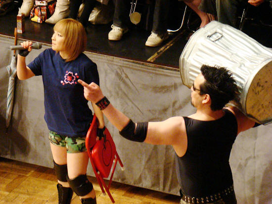 第1試合で勝ちを収めた旭&大石組が佐藤コミッショナーに参戦直訴。