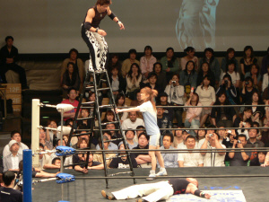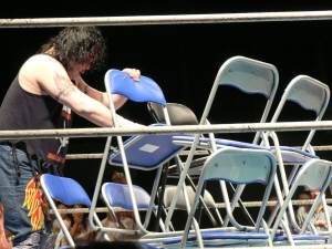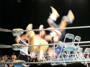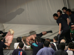 三四郎と後藤、北側で場外乱闘。椅子を積み上げる三四郎。しかし後藤に後ろに回られ…。