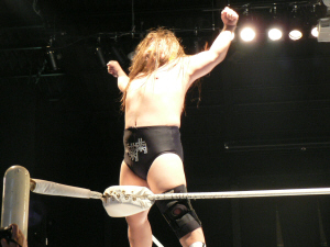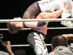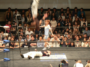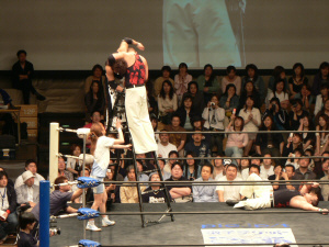 トップロープから雪崩式仕掛けたキンタローが逆に食らった!うわぁ…すげえ。何でこんな事やって平気なの?