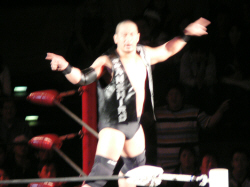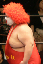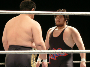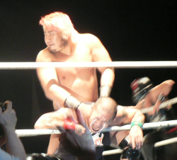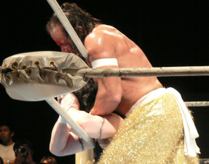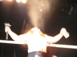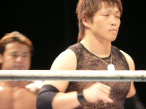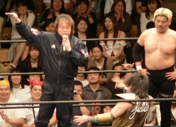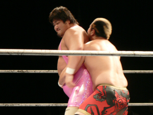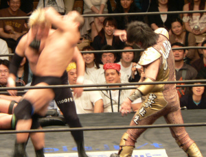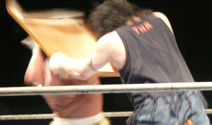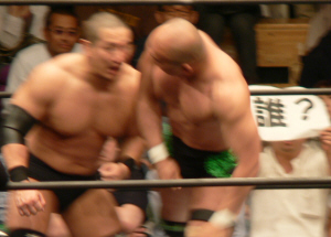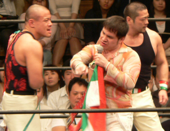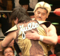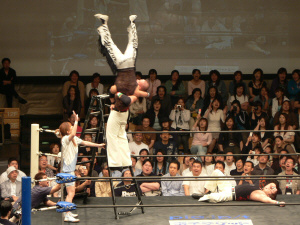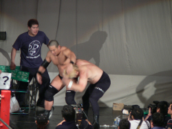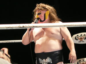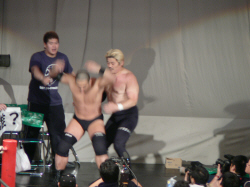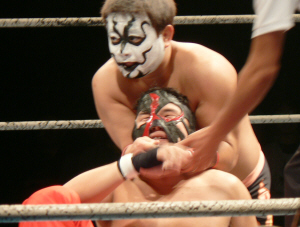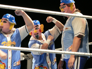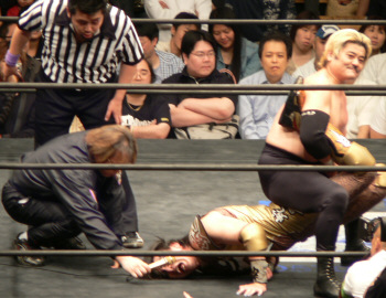とにかく粉っぽい。頭に振りかけたパウダーが動くたびにポワポワ舞うので、歳三がむせて攻撃できないっつう…。村山レフェリーまで本気でむせて可笑しいやら気の毒やら。ヒライはヒールっぽくて(普段より)良かったかも。歳三がマスク剥がされそうになり「バレるバレる!」歳三ピーンチ!結局剥がされてしまい、顔を覆って退場。正体バレなくて良かったね(をぃ)