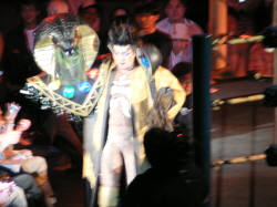リング中央に置かれた蛇の被り物を「これ邪魔じゃないですか?」と蹴り倒す田中氏。何てことするんだ!罰当りめ!