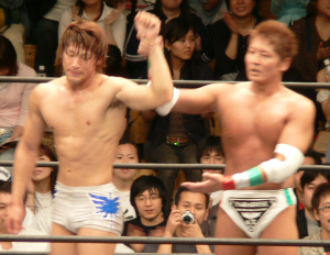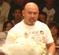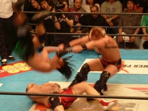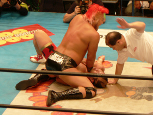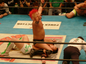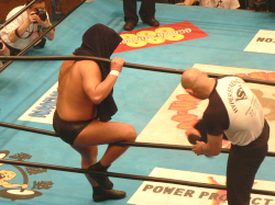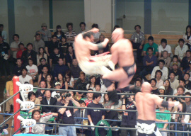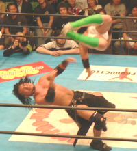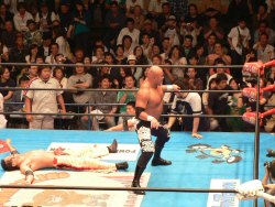 ダメージ残るAKIRAを尻目にSWでオイシイところを戴き(お疲れ様でした~)途中、マスカラスばりのフライングクロスチョップ(コレは知ってる)を繰り出したり、メヒコ帰りをそこはかとなくアピール。こういう所が武藤の巧さなんだなぁ。