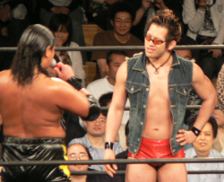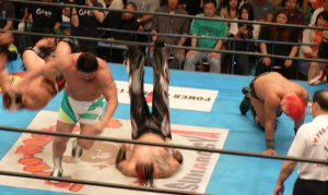 武藤に拝み渡り(本当はオールドスクールって言うの?)するブキャナンをAKIRAがトップロープから迎撃 渋いっ!