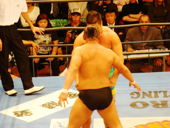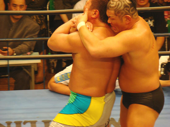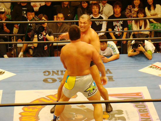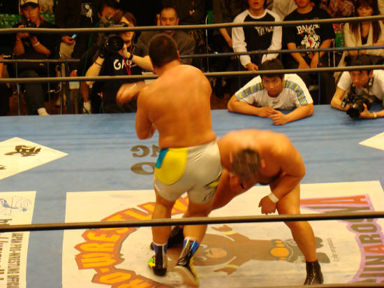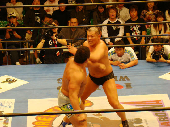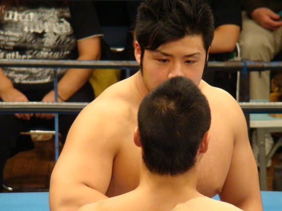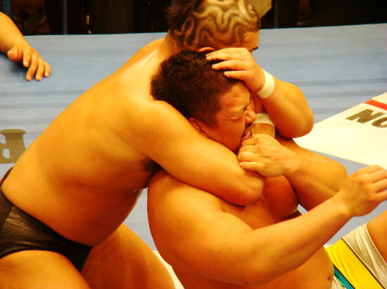 パワーで押せ押せの健介に対し強烈な張り手で対抗するみのる。