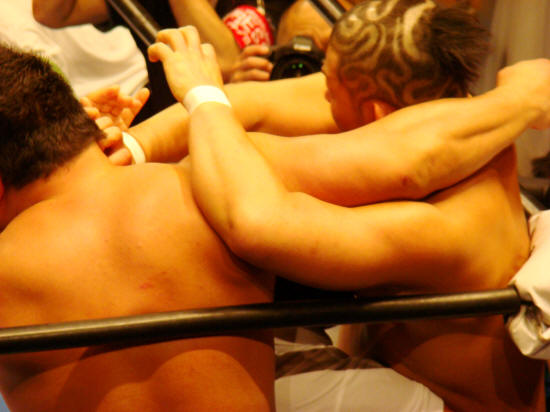 健介が腕ぶん回せばダメージ大。膝をつくみのる、スルリと腕ひしぎ。