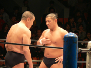 健介いきなり村上にチョップ(はぁ?)村上お返しのキック(えぇ?)数回応酬…またやってるよ…小橋のときみたいな“気合い入れ”。村上もパカ決定(褒め言葉よ)