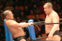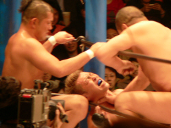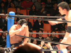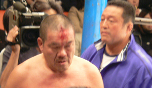 村上の頭突きで流血した組長(ブッチャーの額のようにすぐ割れるのか?)お疲れ様でした。とても盛り上がったセミでしたよ~。ドン荒川さんもセコンドでちょっかい出してたし。