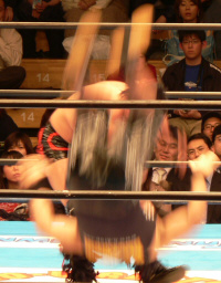試合運びもそこそこ上達、しっかり勝ててよかったね。身体つきがとても良くなってきたのは驚き。ヒールに転向してからの方が練習してる?そのせいか、以前のような力任せでないパワーがつき、技の精度も上がったような。やっぱヒールは強くなくちゃね。対するケアは巧いし強いとは思うんだけど…何で今ひとつ冴えないかなぁ。欲なさすぎか?