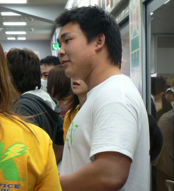 休憩中、売店でサインする勝彦。
