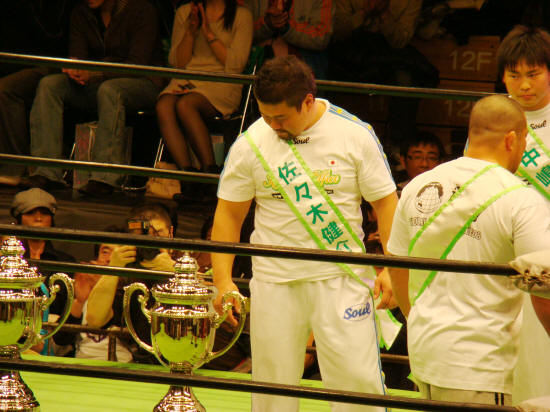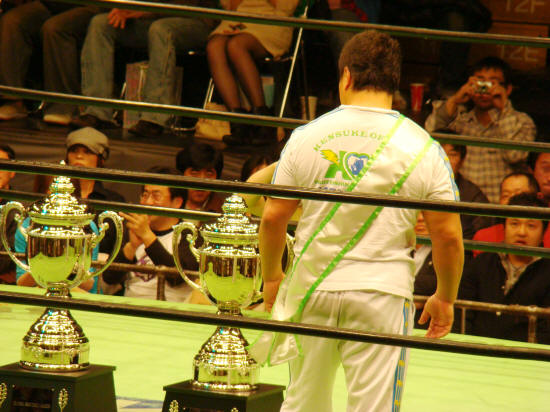 最後までリングに残り、優勝トロフィーをしげしげと眺める健介でありました。