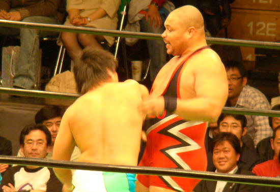 ディーロとブキャナン交互にやられまくる勝彦。パワーの差は歴然…。