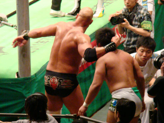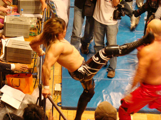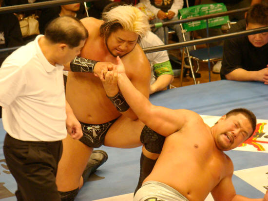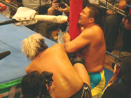 場外にもつれ込み、北側パネルに健介がラリアット誤爆するや腕殺し開始。
