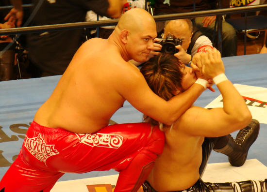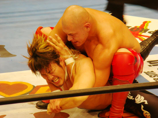 苦悶の叫び声をあげつつ耐える健介。みのるとの三冠戦が思い出されます。