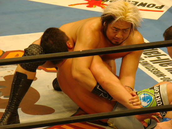 耐えた健介の反撃もありホッとしたところに諏訪魔がスルリとアンクルホールド。