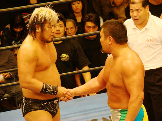 諏訪魔が指を立て「もう一度」の仕草に答え、健介も「もう一度」でガッチリ握手。