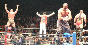 なかなか誠実そうなモーガン、ほんとデカイ!長身のブキャナンが小さく見えるっす。二人でやった拝み渡り、モーガンが足元あやしい蟹歩き…。ファンの温かい歓迎に胸筋ヒクヒクでお返し。しかし雷陣を投げたとき、周りの観客が一斉に「首はダメ首はダメ!」雷陣、首大丈夫だったかなぁ?