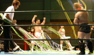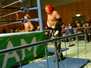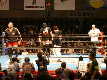 片やヒールユニット。元コンビだけあって、息の合う良い攻めを見せてくれました。もっと憎憎しさがあってもよいですね。今後SUWAが全日に参戦するようなので期待しましょう。しかし、TARUの稼働率がかなり高かったですよ。こんなにキッチリ試合見せてもらったのは初めてかも。観客を煽りつつ試合をしつつ、後半は息切れ電池切れ。それでもゼエゼエ言いながら「うるさいんじゃあ!」いつもの水撒きは忘れずに。TARUがペットボトルを手にしたときは要注意です。というか、この日は水でなくスポーツドリンクだったらしい・・・シャレにならんぞ。最後は健介のやさしめ角度ノーザンライトボムで決まり。勧善懲悪の決着がついてめでたしめでたし。メインで満足、見に来て良かったです。