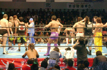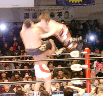 空席が目立つ中、選手の皆さん、良い試合を展開してくれました。何となく昭和のにおいがする興行で、自分的には大満足です。それに手が届く距離での観戦は、やはり音から何から迫力が違います。コジとカズが甘~い香りを振り撒いてました。これが噂のボディバターか。そういえば巡業中、本間はお留守番ですか?腰お大事に。あ、気が付いたら渕さんもいませんでした。寒さでお留守番?