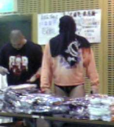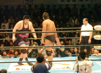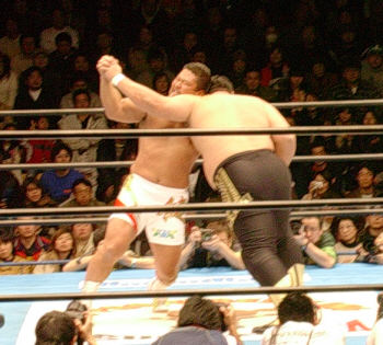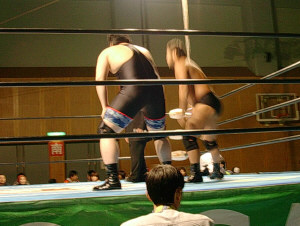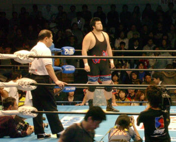 そういえば、腰痛で欠場中の本間が昨日今日とセコンドについていました。まだ歩くのが難儀そうですが、売店で笑顔でサインをする姿も見られて少し安心。ここはじっくり治してもらい、元気な復帰を待つとしますか。そうそう、後楽園名物(?)ガンバレおじさんも連日会場にいました。ガンバレおじさんの声援を聞くのも、観戦の楽しみなひとつです。