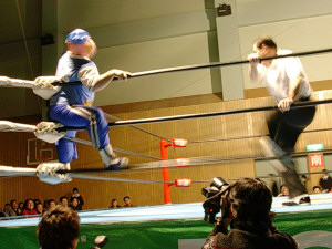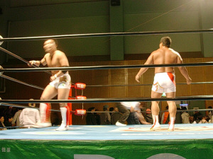 TARU&SUWAのヒールに対して、健介&勝彦が完全なベビーで来るかと思ったら意表をつかれました。アンタら東京愚連隊ですか・・・。野良仕事道具一式をカゴに入れて背負い、頭にハチマキ手にはさすまた。弁慶とも見えます。勝彦はハチマキと首にぶっといチェーン、そしてハンマー片手に入場。こちらは可愛いい運動会のよう。斬新な井出達で颯爽と!だがしかし凶器の準備には余念がなかったけれど、リングインまでは考えていなかったという。カゴしょったままロープをくぐれなくてジタバタする健介。間違いない、この人の頭には筋肉がみっちり詰まっている!いきなり爆笑の渦でしたが、試合が始まれば凶器より肉体の方が強いことをちゃんと証明してくれましたよ。この辺の緩急の差が健介の好きなところなんですわ。それにしても勝彦の成長の著しさったら。試合内容もさることながら、もう少しでお父さんの身長に追いつきそうです。来月の正念場まであと僅か、壊れないよう更なる肉体の頑健さをば。