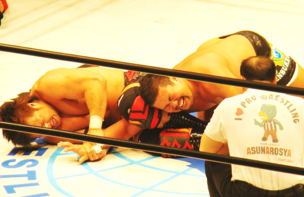 その後、小島が仕掛けたストラングルを「グワッ!」とチカラ任せに振りほどく健介。