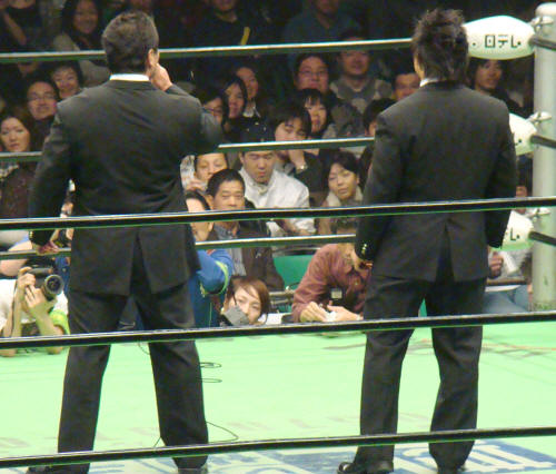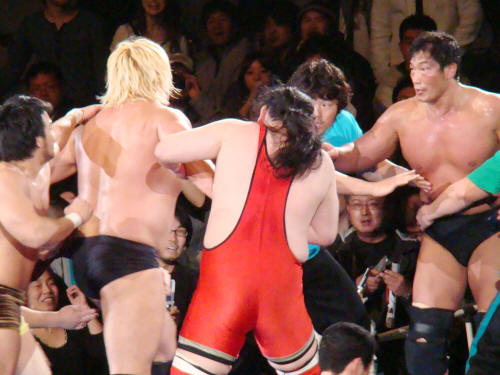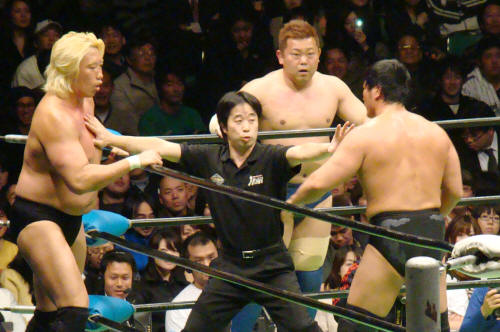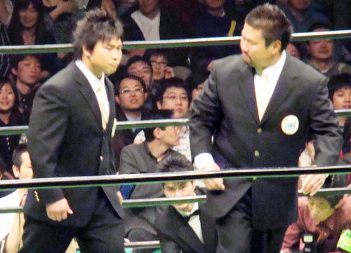 リングアウト寸前、様子を見ていた健介が小島をリングに無理やり戻す。