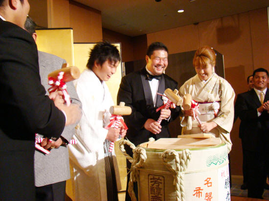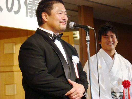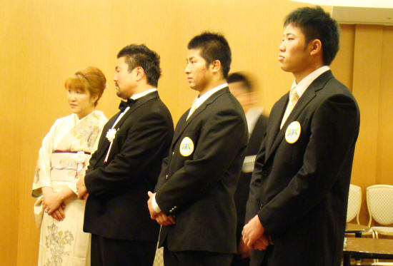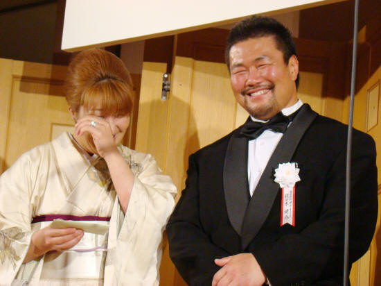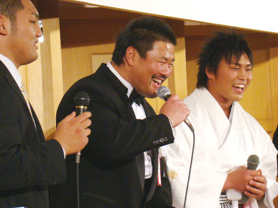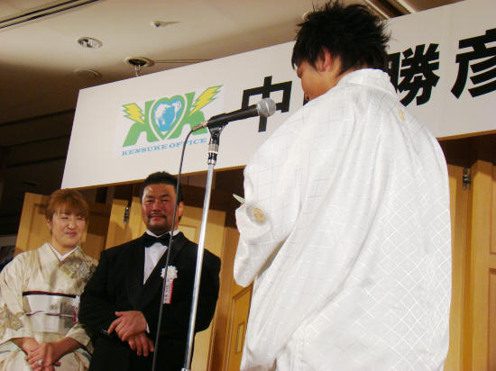 勝彦の挨拶後、健介が壇上に。「自分が言うのも何ですが、勝彦は自慢の息子です!」