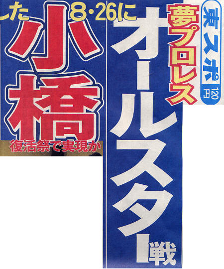 「夢プロレス」「オールスター戦」「8.26」「復活祭で実現か」「小橋」の文字が一面にデカデカ踊ればワクワクせずにはいられません。でもちょっと待って、そこは東スポ。要するに、池上本門寺節分会に集った小橋たちの「出来たらいいね~」話を記事にまとめたようです。さすが東スポクオリティ。夢を見せてくれます。