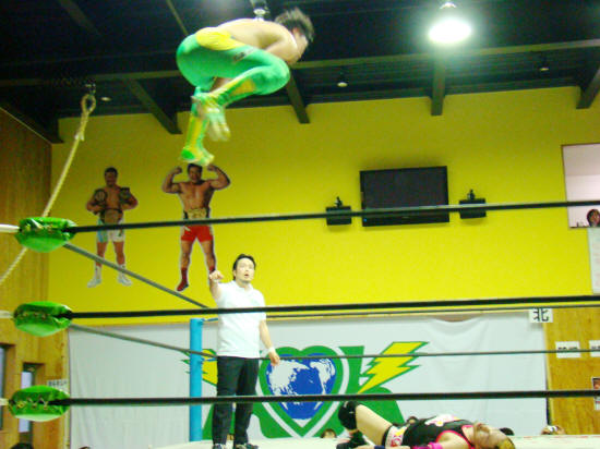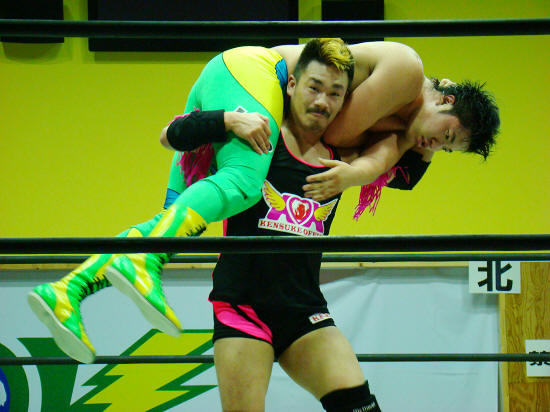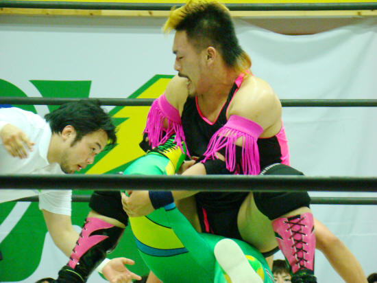 終盤に喰らったデスバレーボムで健斗殆どグロッキーの処をダメ出しでもう一度。