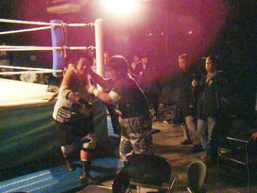 リングでちょっとやりあってすぐ場外戦へ。南から西へと椅子なぎ倒しながら移動。