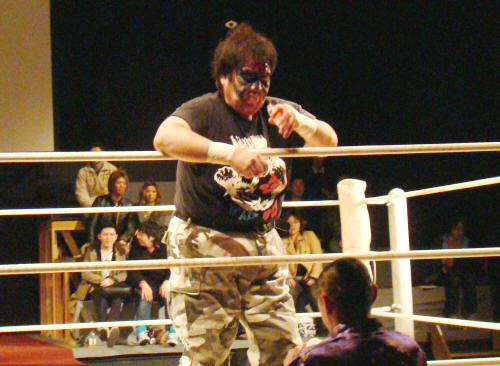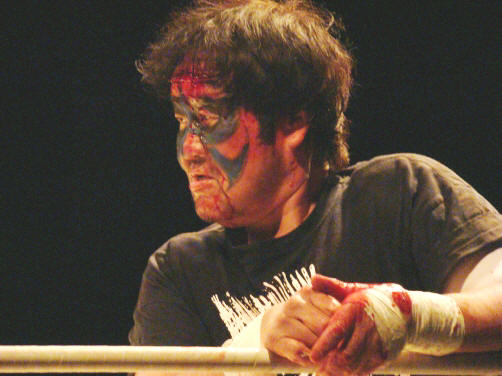 最後は鎖鎌のクサリでgosakuを絞首刑。レフェリーストップでボーゴさんの勝利。