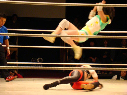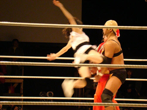ランジェリーは真琴にフラッシングエルボーや側転エルボー(ちょいボディ気味)