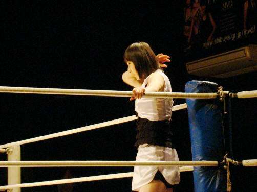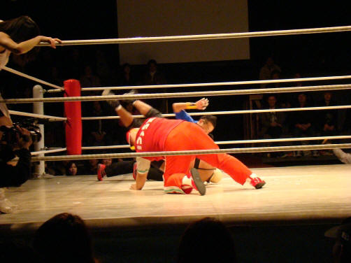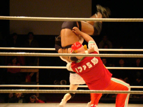 菊ちゃん、真琴のバックを取ろうとしたら後ろ蹴りが股間へ。おおっ…。