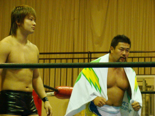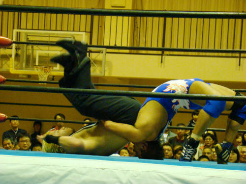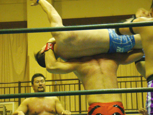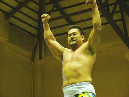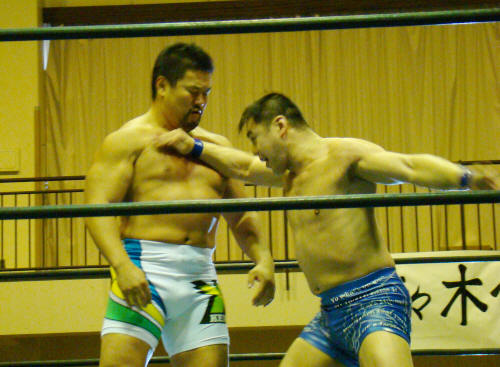 健介がお返しのラリアット。一発…KAZMA持ちこたえる。会心の二発めで終了。