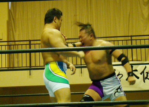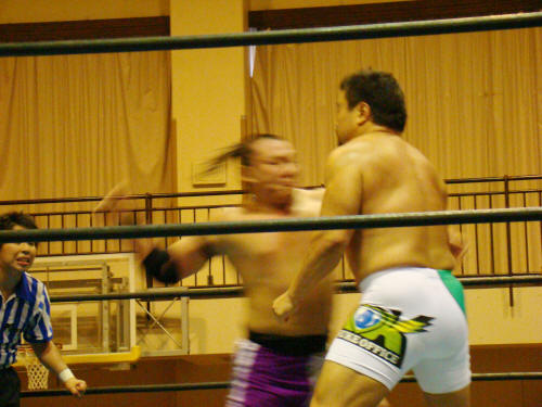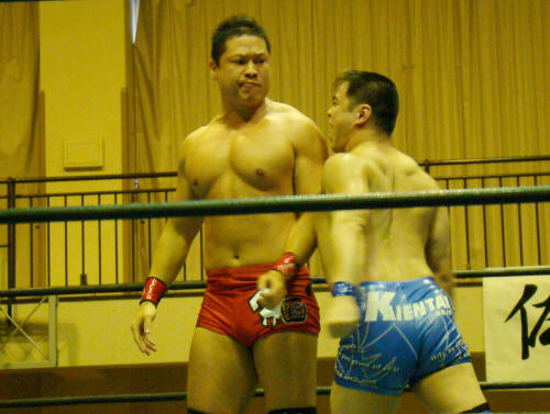 健介、先ずは様子見に一発。KAZMAがお返し。