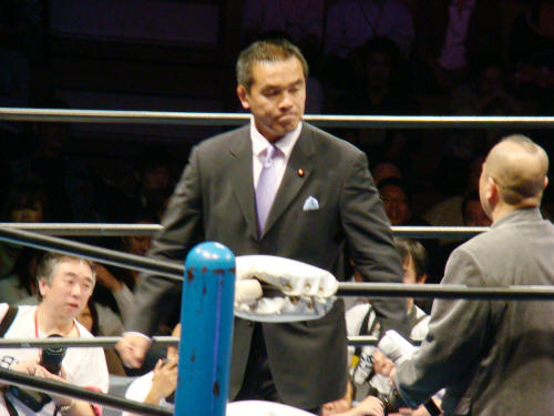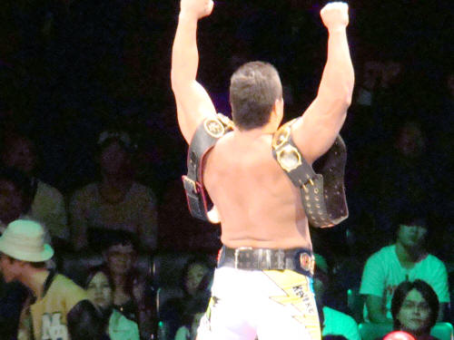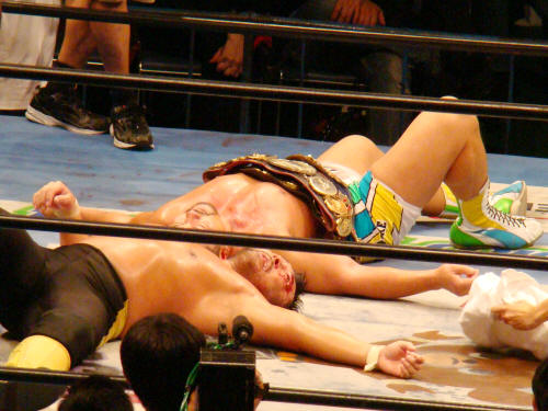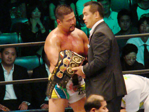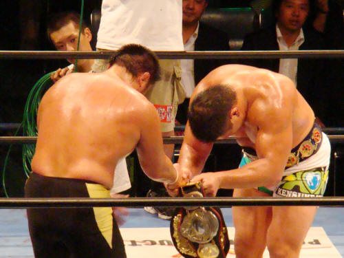 両者、暫く起き上がれず。馳会長が健介のお腹の上にベルトを置きました。