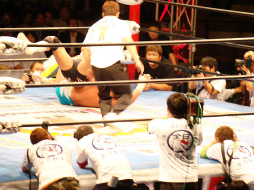 「ロープに足かかってるよ!」明らかにボンバーレフェリーの裁定ミスです。